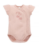 Pārliekams bodijs ar īsām piedurknēm MEŽA ZEMENĪTE ir izgatavota no maigi rozā kokvilnas. Ar apdruku priekšpusē.